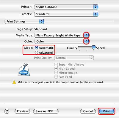 Make the appropriate Media Type, Color, and Mode settings.