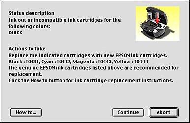 When the ink runs low or out, a How to button appears below the text box. Click How to, and EPSON Status Monitor 3 will lead you step-by-step through the cartridge replacement procedure.