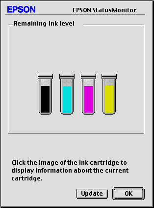 You can also use this utility to check ink levels before printing. When open, EPSON StatusMonitor displays the amount of ink remaining at the time it was opened. To update the ink level information, click Update.
