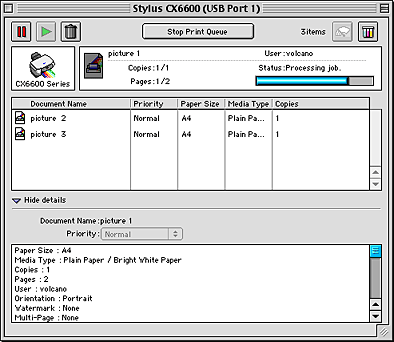 EPSON Spool Manager is similar to Windows Print Manager. If it receives two or more print jobs at one time, it holds them in the order that they were received (with printers on a network, this may be called a print queue). When a print job reaches the top of the line, EPSON Spool Manager sends the job to the printer. From the spool manager, you can view print status information about the print jobs that have been sent to this product. You can also cancel, pause, and resume selected print jobs.