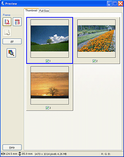 In the Thumbnail Preview window: EPSON Scan automatically locates the multiple photos, and then preview them as thumbnail images. Select the number check box of an image you want to scan.