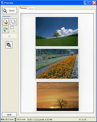 Depending on the materials you want to scan, EPSON scan may not be able to automatically locate the target images, or preview the images as thumbnails. In this case, preview the images in the Normal Preview window.