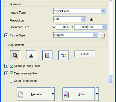 When the output size of the scanned image is already decided, select an appropriate setting from the Target Size list. A marquee proportional to the measurements of the Target Size setting appears in the Preview window. You can move this marquee to the area of the image you want to scan. For more details, see the online help.