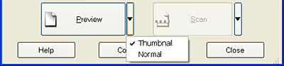 Clicking the Preview button starts prescanning and previews the image. Depending on the scanning mode and the Document Type settings, a small arrow appears to the right of the Preview button, allowing you to select a preview method. Click the arrow and select Thumbnail or Normal to change the preview method.