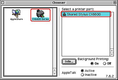 Choose Chooser from the Apple menu. Click an icon for this product and select the printer port that you want to use from the Select a printer port list.