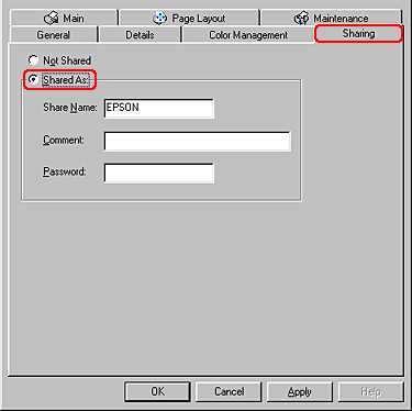 Select the Share this Printer check box, then type the printer name and password information as necessary.