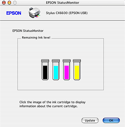 The graphic displays the amount of ink that was remaining when EPSON StatusMonitor was first opened. To update the ink-level information, click Update.
