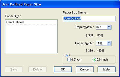 To delete a custom paper size from the list, open the User Defined Paper Size dialog and select the user-defined paper size name you want to delete. Then, click Delete.