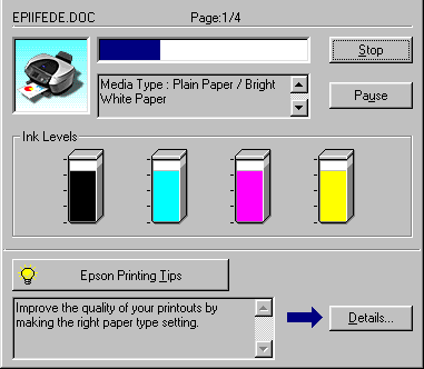 EPSON Spool Manager is similar to Windows Print Manager. If it receives two or more print jobs at one time, it holds them in the order that they were received (with printers on a network this may be called a print queue). When a print job reaches the top of the line, the EPSON Spool Manager sends the job to the printer. From the Spool Manager, you can cancel print jobs. You can also view print status information about the print jobs which have been sent to this product, as well as pause and resume selected print jobs.