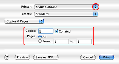 Select Stylus CX6600 as the Print setting, then make the Copies & Pages settings.