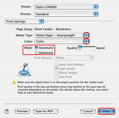 Make the appropriate Media Type, Color, and Mode settings. See online help for details.
