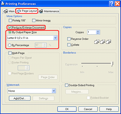 Click the Page Layout tab, then select the Reduce/Enlarge Document check box. You can select the following settings to change the size of your document.
