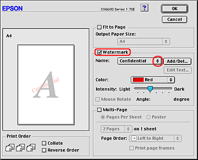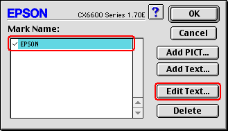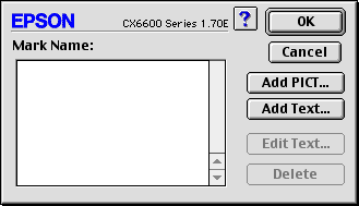![]() | To use an image file as a watermark, click Add PICT. Specify the desired image file, then click Open. |