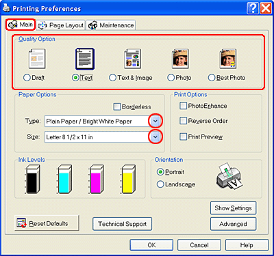 ![]() | Click the Main tab, then make the Quality Option setting. For details, see online help. |