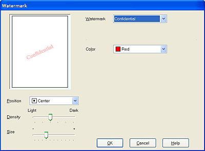 ![]() | Make sure that the appropriate watermark is selected in the Watermark list, then make Color, Position, Density, Size, Font, Font Style, and Angle settings. For details, see online help. Your settings are reflected in the display at the left side of the dialog box. |