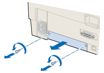 Use a cross-head screwdriver to remove the two screws securing the shield plate to the optional interface slot; then remove the plate. Be sure to keep both screws; you may need to use them again if you re-install the shield plate.