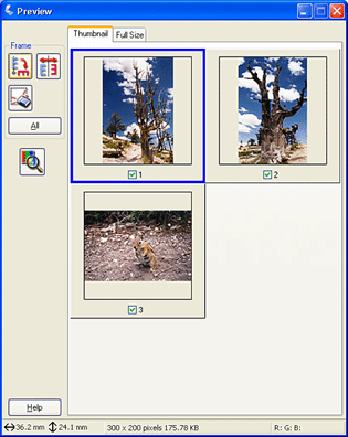 The Thumbnail Preview method allows you to preview multiple images in a thumbnail layout. EPSON Scan automatically locates the target images and applies the Auto Exposure feature to each image. You can modify each thumbnail image and make additional image adjustments. You can also use marquees to scan selected portions of an image. For details on marquees, see Using Marquees.