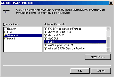 Select Microsoft from Manufacturers box and TCP/IP from Network Protocols, and click OK.