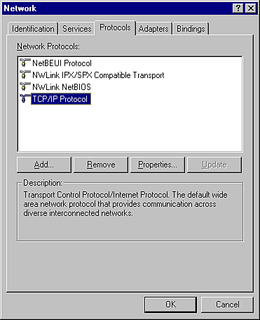 Check that TCP/IP Protocol is included in the Network Protocols: list box.