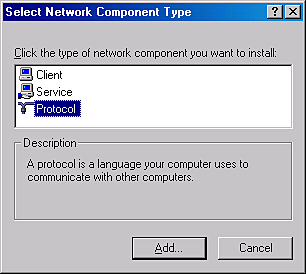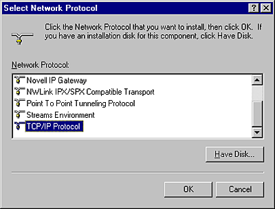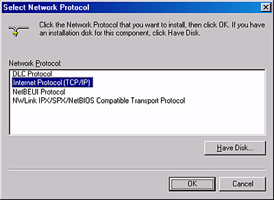 Select Internet Protocol (TCP/IP) in the Network Protocol list box and click OK.