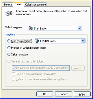 If you need to disable the Scanner events, select Take no action in the scanner's Properties dialog box.