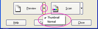 Clicking Preview starts prescanning and previews the image. Depending on your mode and the Document Type settings, a small arrow appears to the right of the Preview button allowing you to select a preview method. Click the arrow and select Thumbnail or Normal to change the preview method.