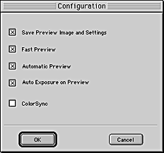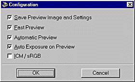 Click the Configuration button on the Advanced menu to view the following dialog box. You can make settings that affect the Preview window.