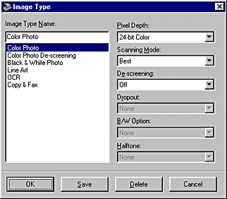 To delete an Image Type setting, select the setting name to be deleted in the Image Type Name menu, then click Delete.