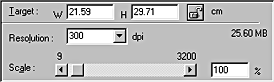 The current size of width-to-height of the target image can be locked, allowing the ratio of width-to-height of the Source image to change according to the scale value, or the scale value to change according to the ratio of width-to-height of the Source image. This is especially useful in cases where the size of an image does not fit the size of the paper on which you want to print the image, but you want to keep the image's original proportions. Enter the size of the paper in the Width and Height fields of the Target box and then click the lock button. The scale value is automatically changed, maintaining the current ratio of width-to-height to fit the paper.