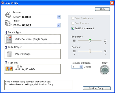 Use this application to turn your scanner into a digital copy machine, yet its functions are far more powerful and flexible than the conventional copy machines. Using this application, you can scan and then print images as photos. You can copy in various sizes, or place several photos on the same page. Before you print an image, you can see the effects of image adjustments using the Preview window. When you launch this application, the following screen appears.