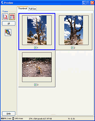 In the Thumbnail Preview window: EPSON Scan automatically locates the frames of the film and multiple photos, and then preview the images as thumbnail images. Select the number check box of an image you want to scan.