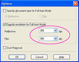 When you want to print scanned images on your EPSON ink jet printer or get prints done at your favorite film developing service, set the output resolution to 300 dpi. If you select a resolution higher than 300 dpi, printing takes a longer time but the output quality does not change.