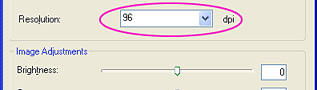 When you want to view scanned images on the computer screen, set the output resolution to 96 dpi. The monitor can reproduce images only up to 96 dpi. Scanning at a high resolution is counterproductive. The low resolution image files are smaller and easy to handle. Therefore, use low resolution to scan images for use on the Internet or in e-mail.