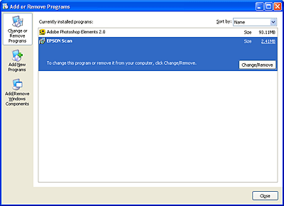 ![]() | Select EPSON Scan from the list, then click Change/Remove (for Windows XP or 2000 users) or Add/Remove (for Windows Me or 98 users). |