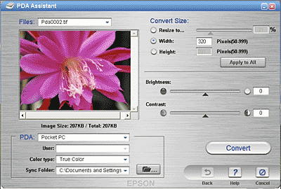 Use this application to scan and convert an image to a PDA-enabled file format. When you launch this application, the image is scanned from EPSON Scan and displayed in the Verify Assistant dialog box. Click Next and the following dialog box appears. Click Convert to export the image to the Sync folder or the specified folder.