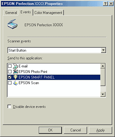 You can assign any application, other than EPSON Smart Panel, which supports the Scanner events (for example, Imaging for Windows, as long as it is installed) on Windows to the buttons on the scanner. When you press the