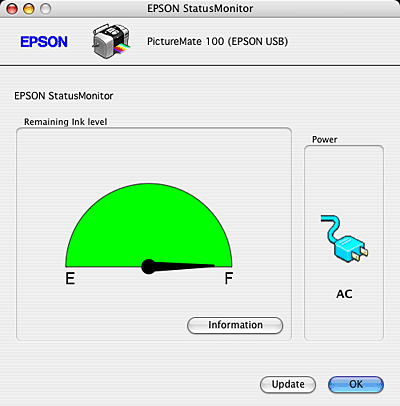 You can also use this utility to check ink level and power status before printing. EPSON StatusMonitor displays the amount of ink remaining at the time it was opened. To update the ink level information, click Update. When you use the printer with an optional battery, you can check the amount of power remaining in the battery.