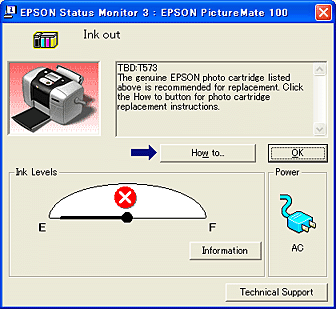 When the ink runs low or out, a How to button appears below the text box. Click How to, and EPSON Status Monitor 3 will lead you step-by-step through the cartridge replacement procedure.