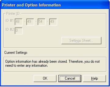 Depending on the configuration of your system, the information displayed in the Printer and Option Information dialog box may be updated automatically, or may need to be entered manually.