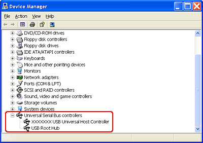 ![]() | Click on the Universal Serial Bus controllers option, and check if the USB Universal Host Controller and the USB Root Hub are identified. If the USB Universal Host Controller and the USB Root Hub are identified, your Windows operating system provides USB support. |