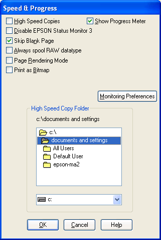 You can increase print speed by selecting certain settings in the Speed & Progress window. Click the Speed & Progress button on your printer driver’s Maintenance window. The following screen appears.