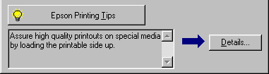 Tips for getting the most out of your EPSON printer software appear in the text box at the bottom of the Progress Meter window. A new tip appears every 30 seconds. For more details on the tip which is currently displayed, click the Details button.