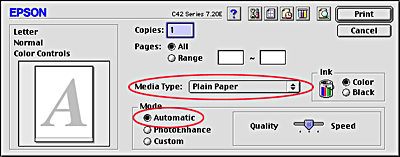 Select Plain Paper as the Media Type setting and Automatic as the Mode setting.