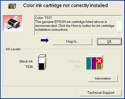 When the ink runs low or out, a How to button appears below the text box. Click How to, and EPSON Status Monitor 3 will lead you step-by-step through the cartridge replacement procedure.
