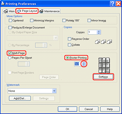 Click the Page Layout tab, select Multi-Page, then select Poster Printing. Click the up or down arrow to select 2x2, 3x3, or 4x4.