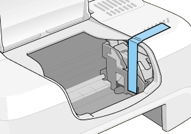 ![]() | Open the printer cover again. Secure the ink cartridge holder to the printer with tape as shown below, then close the printer cover. |