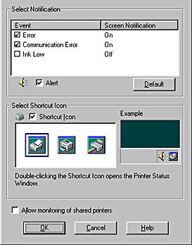 Select the Shortcut Icon check box to have a shortcut icon placed in your Windows taskbar. Clicking the shortcut icon in the taskbar will open EPSON Status Monitor 3. Right-clicking the icon will display a shortcut menu, where you can access some of the printer utilities. To select which icon will be displayed, click the icon your prefer from the choices given; your selection will be shown at the right. |