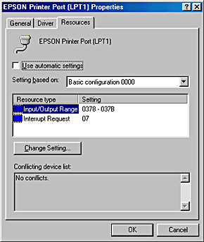 ![]() | Click the Resources tab, then clear the Use automatic settings check box. Write down the Input/Output Range settings shown in the resource settings box. |
