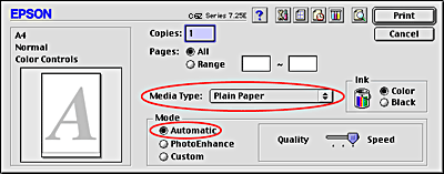 Select Plain Paper as the Media Type setting, and Automatic as the Mode setting.