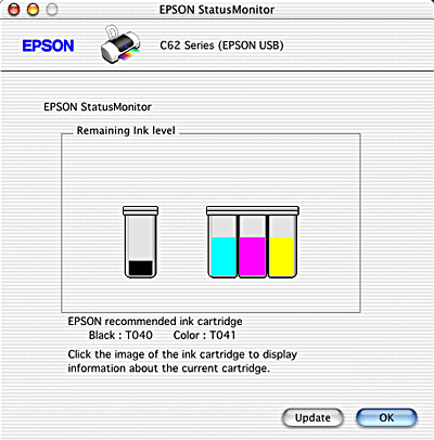 You can also use this utility to check ink levels before printing. When open, EPSON StatusMonitor displays the amount of ink remaining at the time it was opened. To update the ink level information, click Update.
